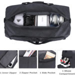 - [ Thoughtful Design ] : The side shoe compartment has two exclusive ventilated air vents and can also be used as a dirty laundry compartment, water & odor resistant. 1 zipper pocket as sleeve on the back of the duffle is designed to keep the bag secure when put over the telescoping handle of a suitcase. The grip and shoulder straps are all padded to reduce the burden on the hands or shoulders.