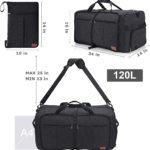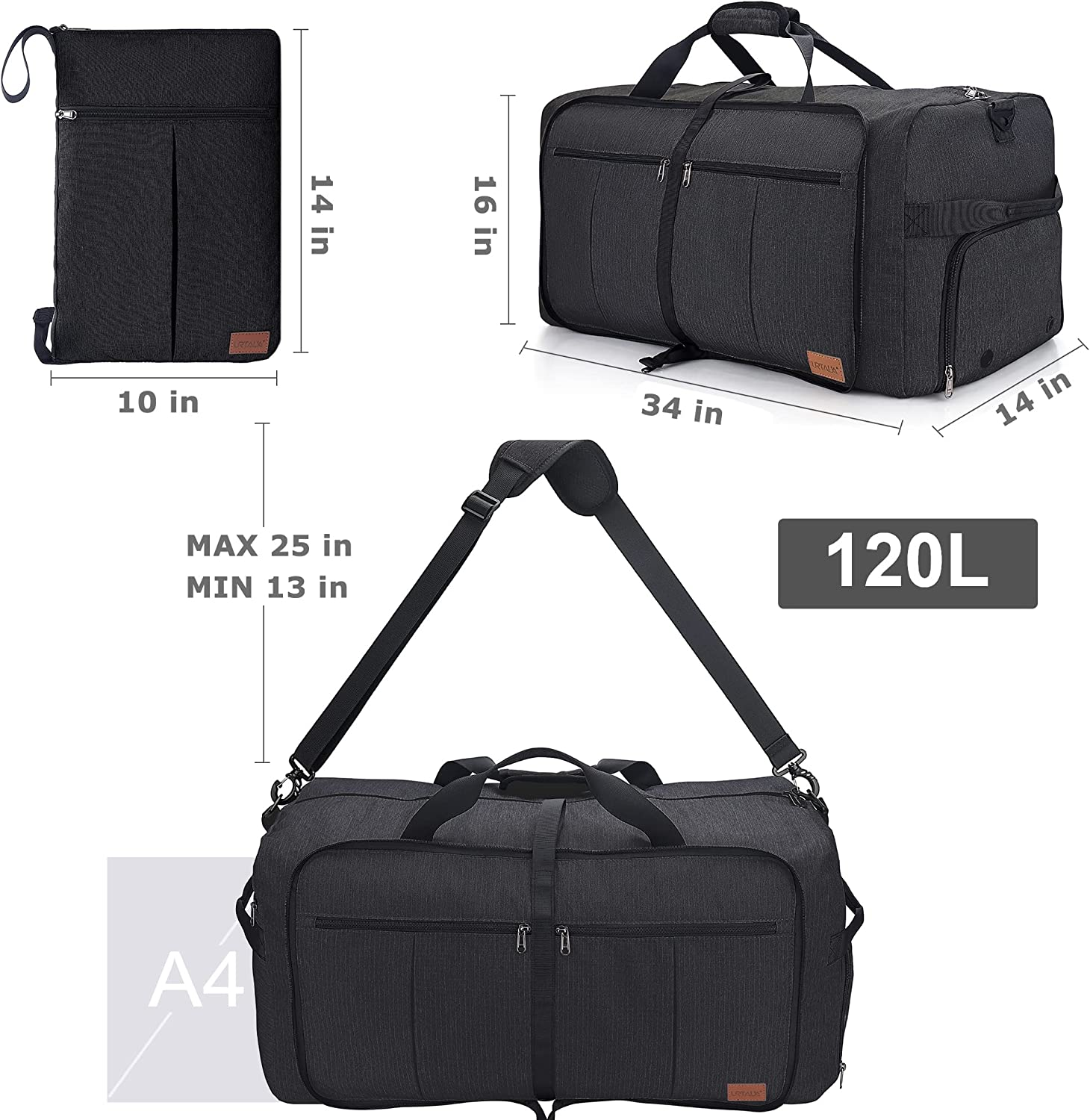 - [ Foldable & 120L Extra Large Capacity Duffle Bag ] : It expands to 34 x 14 x 16 inches, has a capacity of 120 liters, weighs 1.9 pounds and can be fast folded into itself with a compact size of 14″ x 10″ x 3″, only 1/18 of a regular size luggage. Always take this folding duffle with you on any trip, open up when you need to carry gifts for your friends, or to transfer stuffs from your damaged luggage.