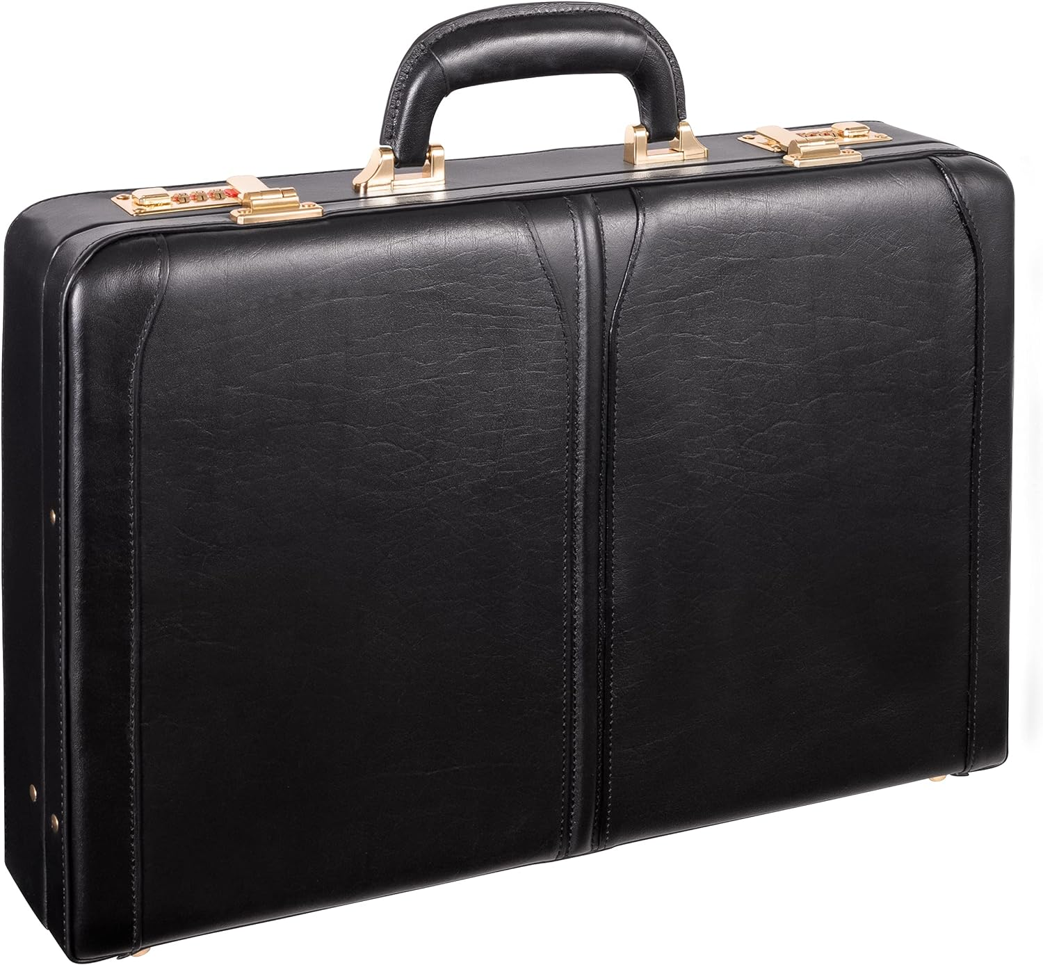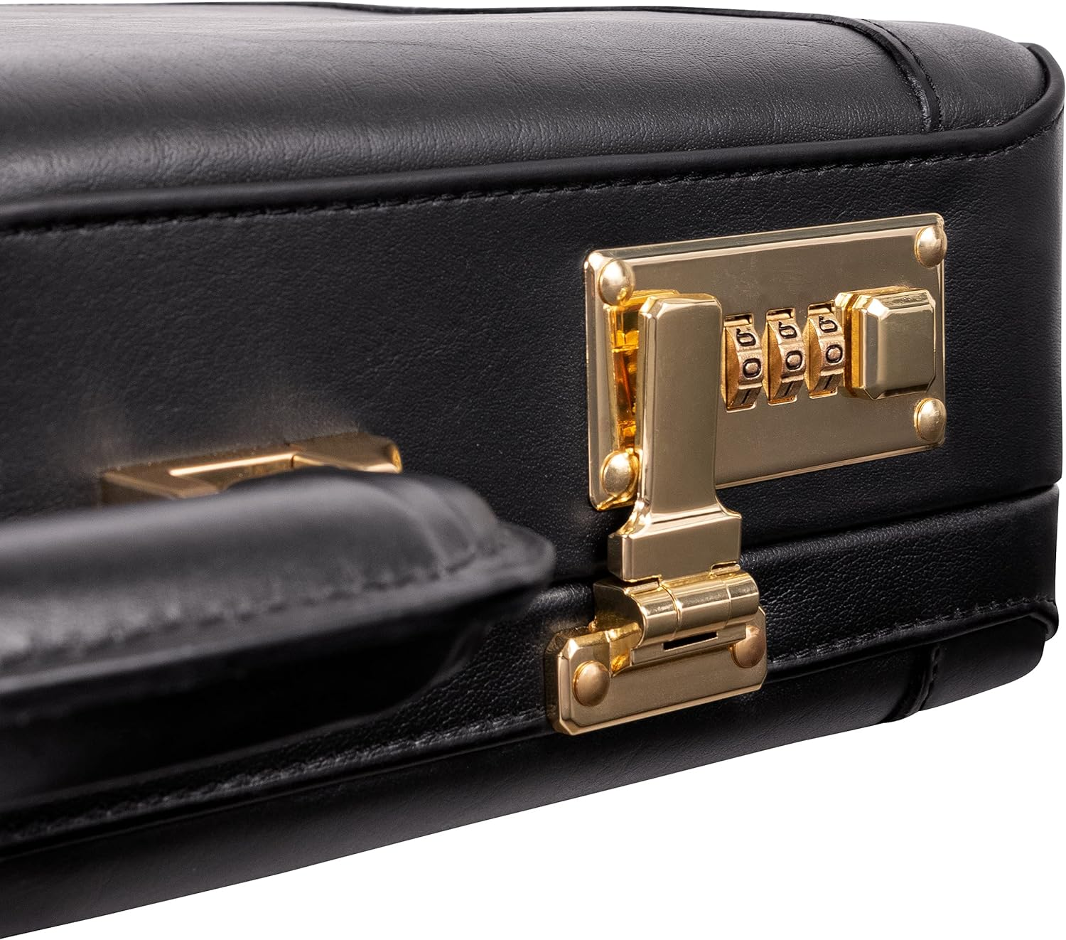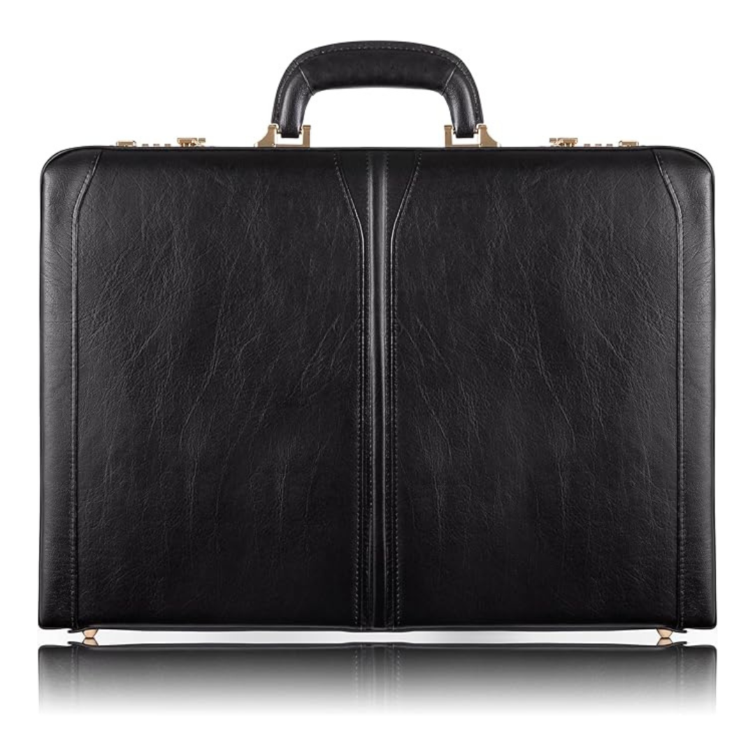 Slim design. 3-digit combination lock for added security.Gold-finished hardware.Comfortable top carry handle.Protective feet keeps case from falling over.Easily accessible compartment opens and stays upright at 90 degrees.Main access compartment provides storage space for files.Interior includes an organizer section that holds business cards, cell phones, pens, notepads and calculators.Adjustable 3-file organizer for files.Suede interior padding.Material: Full Grain Oil Tanned LeatherColor: Brown, BlackSize: 18”W x 3.5”D x 13”HHand strap drop length: 2″Weight: 5.0 lbMcKlein’s one year warranty