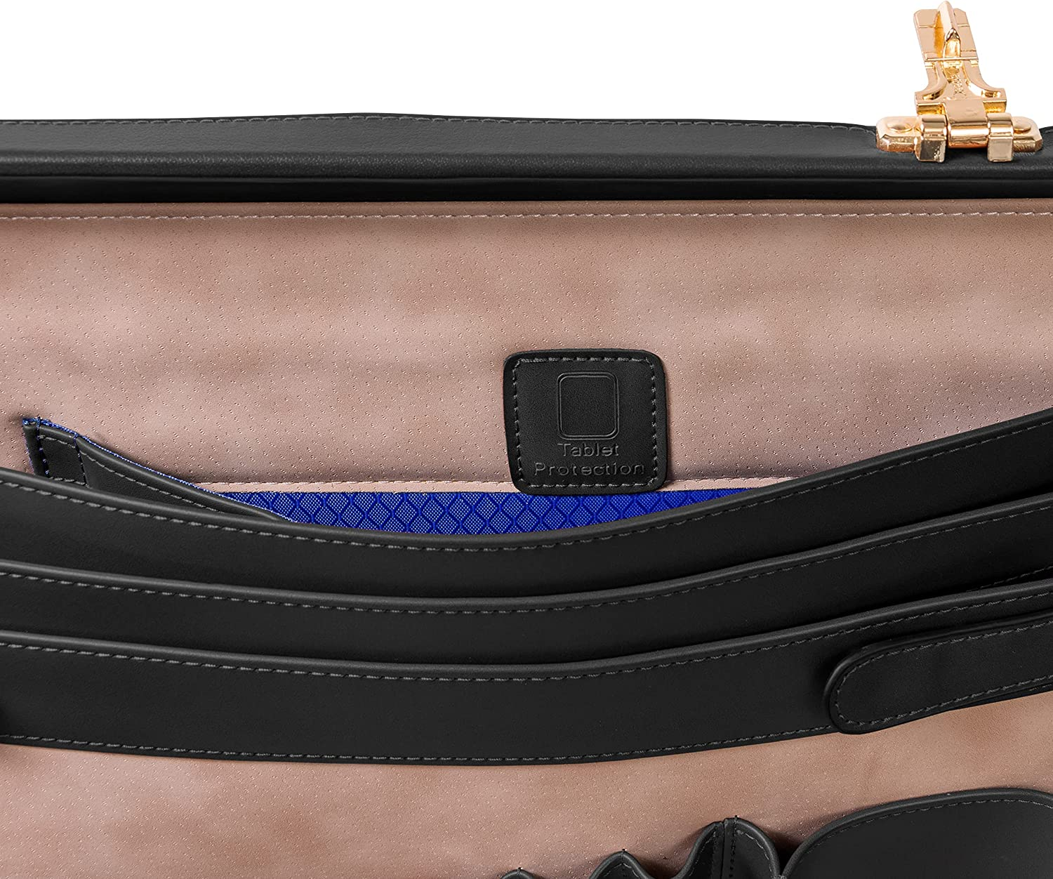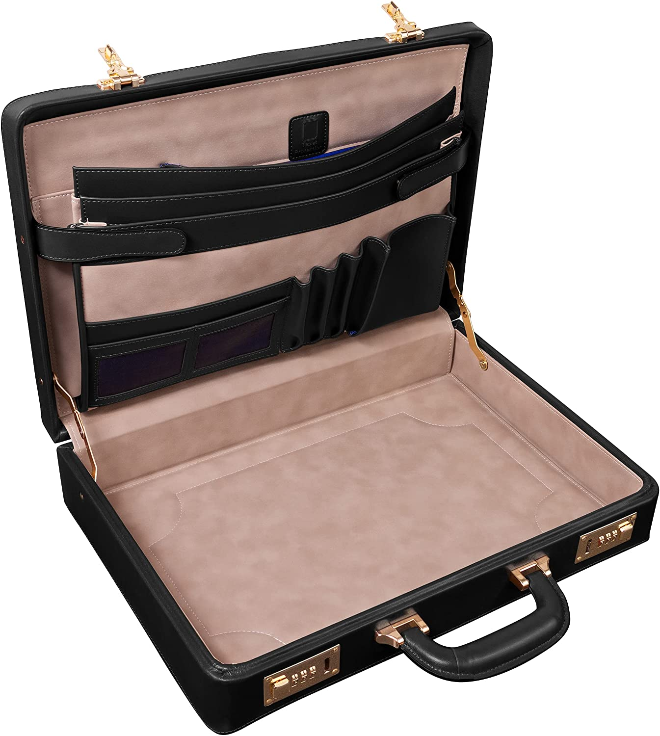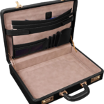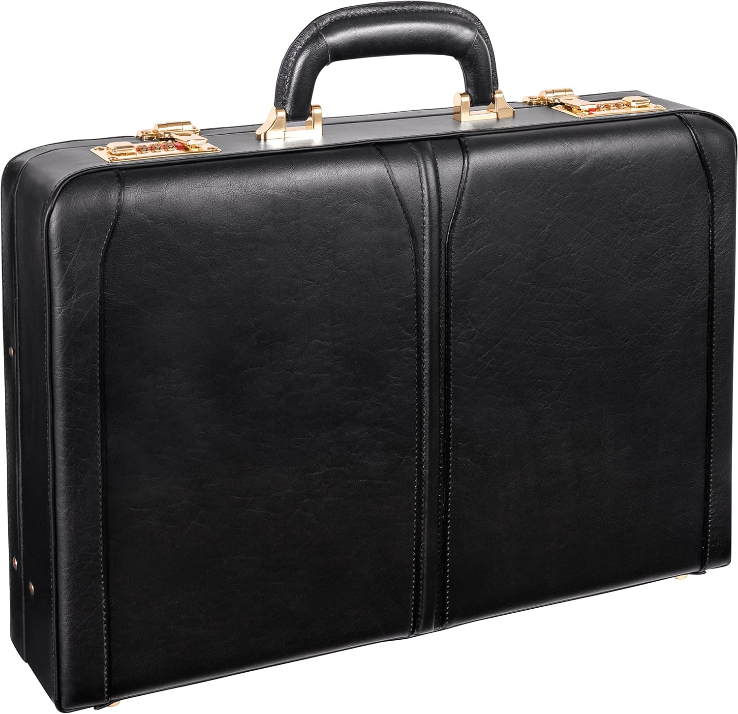 Slim design. 3-digit combination lock for added security.Gold-finished hardware.Comfortable top carry handle.Protective feet keeps case from falling over.Easily accessible compartment opens and stays upright at 90 degrees.Main access compartment provides storage space for files.Interior includes an organizer section that holds business cards, cell phones, pens, notepads and calculators.Adjustable 3-file organizer for files.Suede interior padding.Material: Full Grain Oil Tanned LeatherColor: Brown, BlackSize: 18”W x 3.5”D x 13”HHand strap drop length: 2″Weight: 5.0 lbMcKlein’s one year warranty