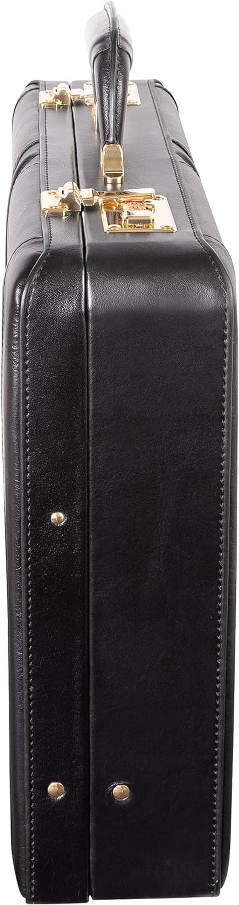 Slim design. 3-digit combination lock for added security.Gold-finished hardware.Comfortable top carry handle.Protective feet keeps case from falling over.Easily accessible compartment opens and stays upright at 90 degrees.Main access compartment provides storage space for files.Interior includes an organizer section that holds business cards, cell phones, pens, notepads and calculators.Adjustable 3-file organizer for files.Suede interior padding.Material: Full Grain Oil Tanned LeatherColor: Brown, BlackSize: 18”W x 3.5”D x 13”HHand strap drop length: 2″Weight: 5.0 lbMcKlein’s one year warranty