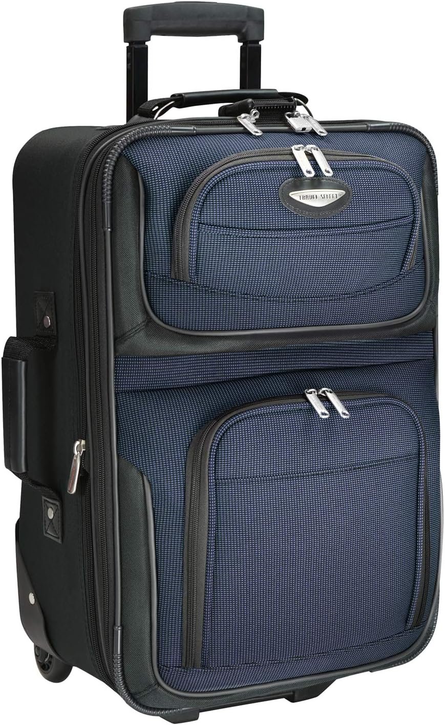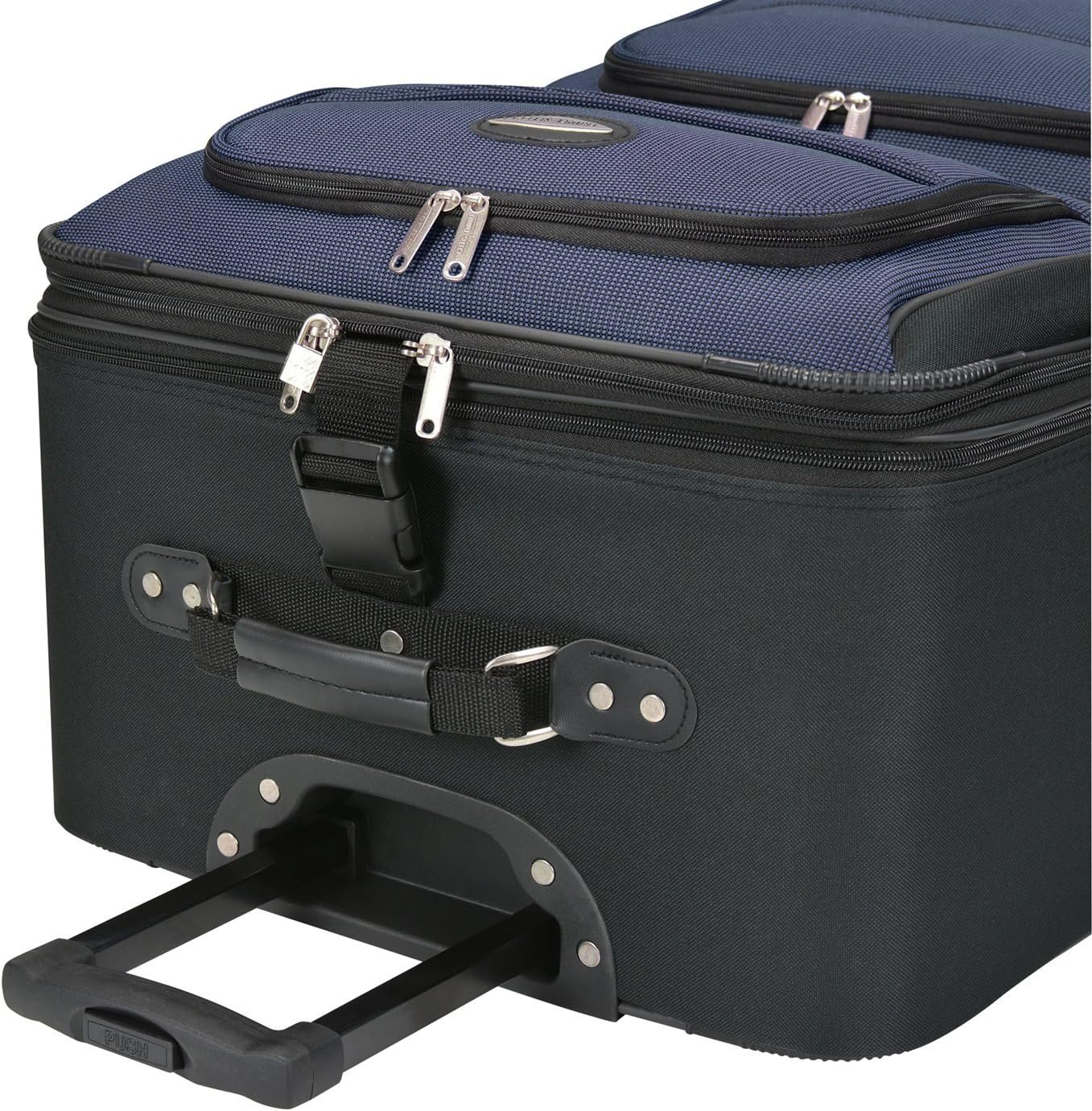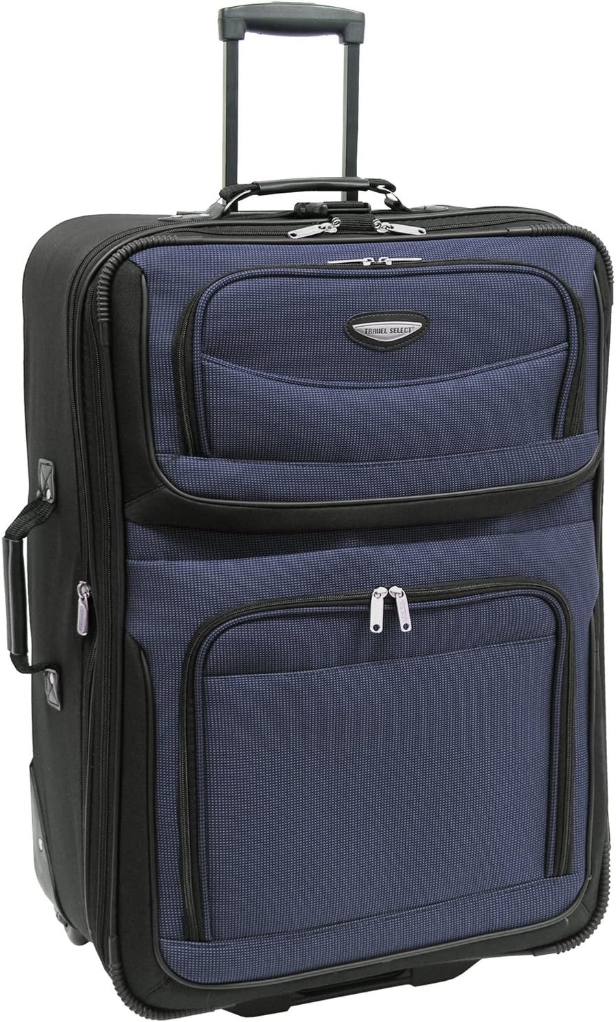 Travel in style with this expanded Amsterdam 4-piece luggage set. Deluxe set includes four packing cubes to help organize your belongings. Versatile luggage set offers luxury and durability. Available in Red, navy, orange, and gray color options. Luxurious superior two-tone polyester fabrication with PVC backing. Deluxe internal retractable push-button handle system. In-line skate wheels with corner protectors. Expandable feature on all uprights. Multiple front zippered pockets. Comfortable top and side carry handles. Bag clasp for toting additional bags. Large zippered mesh lid pocket and dual shoe pockets. Full imprinted lining. Elastic tie down straps helps secure and compress belongings. ID window on back panel. Travel tote has adjustable shoulder strap with padded handle. Piggy back strap on back panel to slip over upright handle. Spacious main compartment with a top center zippered opening. Product Dimensions: 29 inches high x 17 inches wide x 10 inches deep (expands to 12 inches deep) 9.5 lbs.; 25 inches high x 15 inches wide x 9 inches deep (expands to 11 inches deep) 8.5 lbs.; 21 inches high x 13 inches wide x 7.5 inches deep (expands to 10 inches deep) 7.7 lbs.; Travel tote: 15 inches high x 11 inches wide x 6 inches deep 2 lbs.
