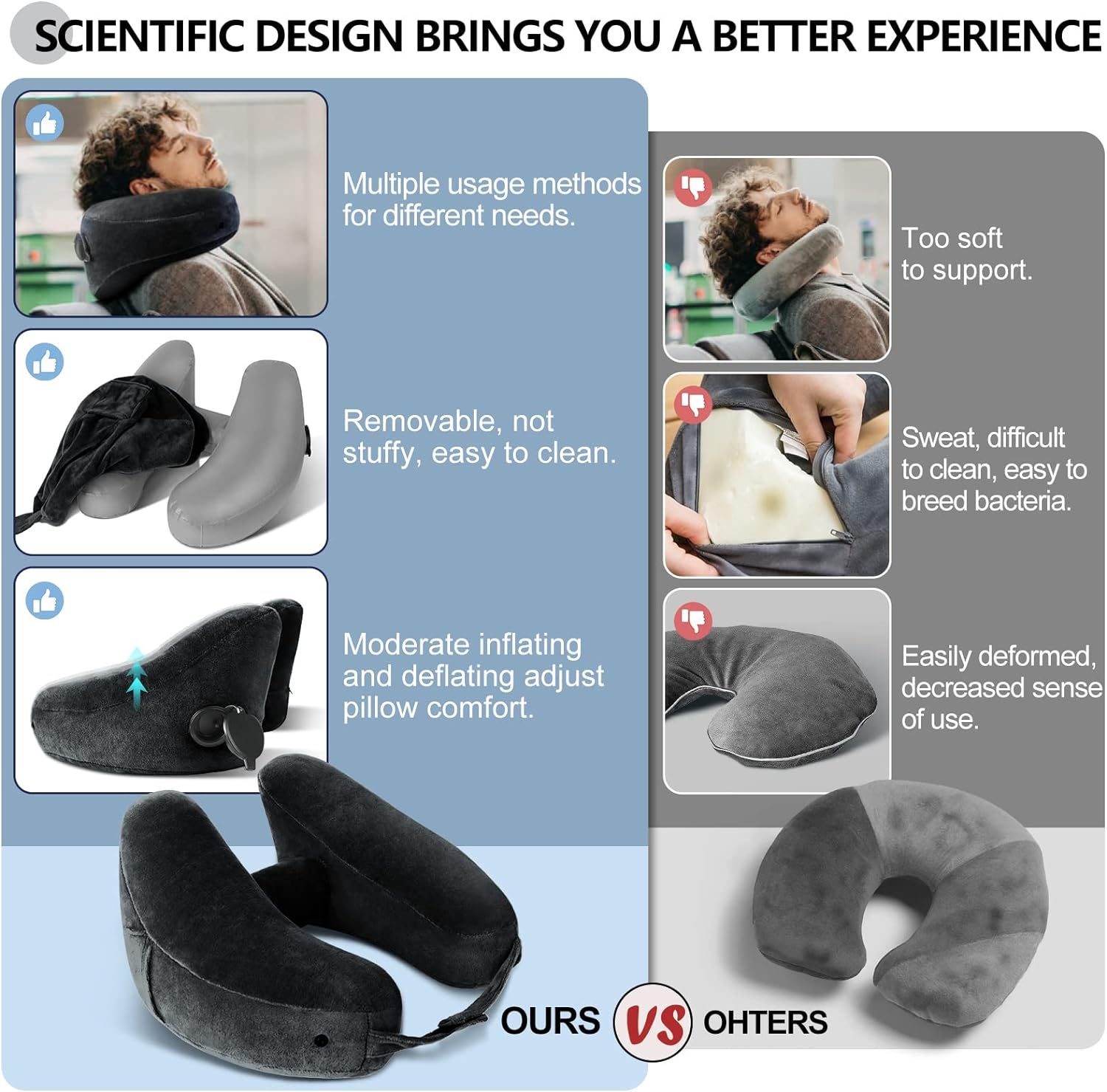 - 【Fast Filling】: The neck travel pillow can be inflated in 3 seconds without embarrassment in public. This patented valve maintains good air and does not leak for a long time. The most comfortable to relax if the travel neck pillow is blow up to 80-90%.