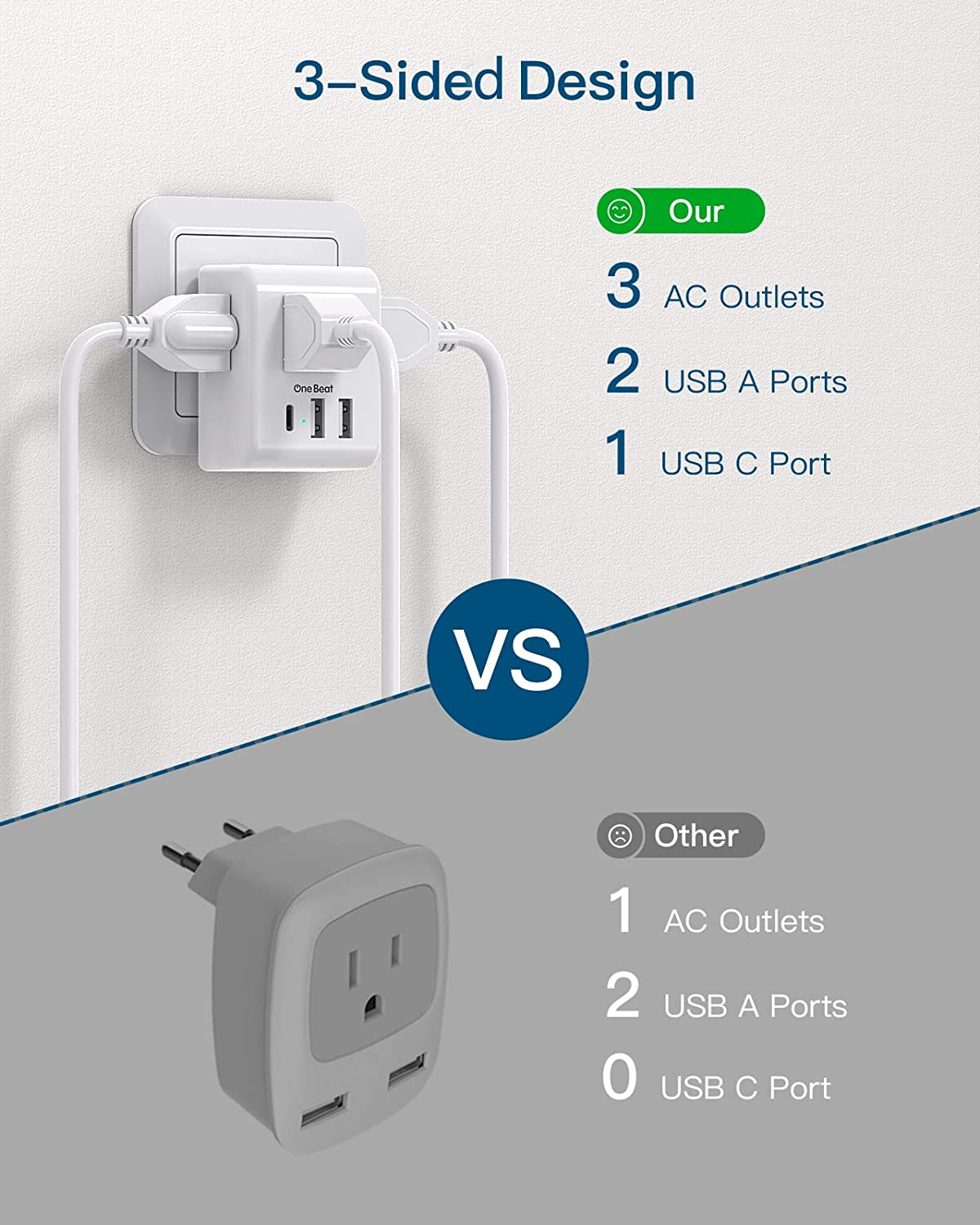 - 【6 in 1 EU Power Adapter】- The European travel plug adapter turns 1 European Type C outlet into 3 standard American outlets, 2 USB-A and 1 USB-C charging port, Max Capacity Up to 2500 Watt (max 250 Volt, 10 A); 3 USB Ports can charge up to 3.1A, allowing you charge 6 devices simultaneously. ideal for cell phone, tablet, power bank and other electrical chargers; No need to carry extra adapter and power strip for your traveling, a small US to Europe plug adapter can save your suitcase space