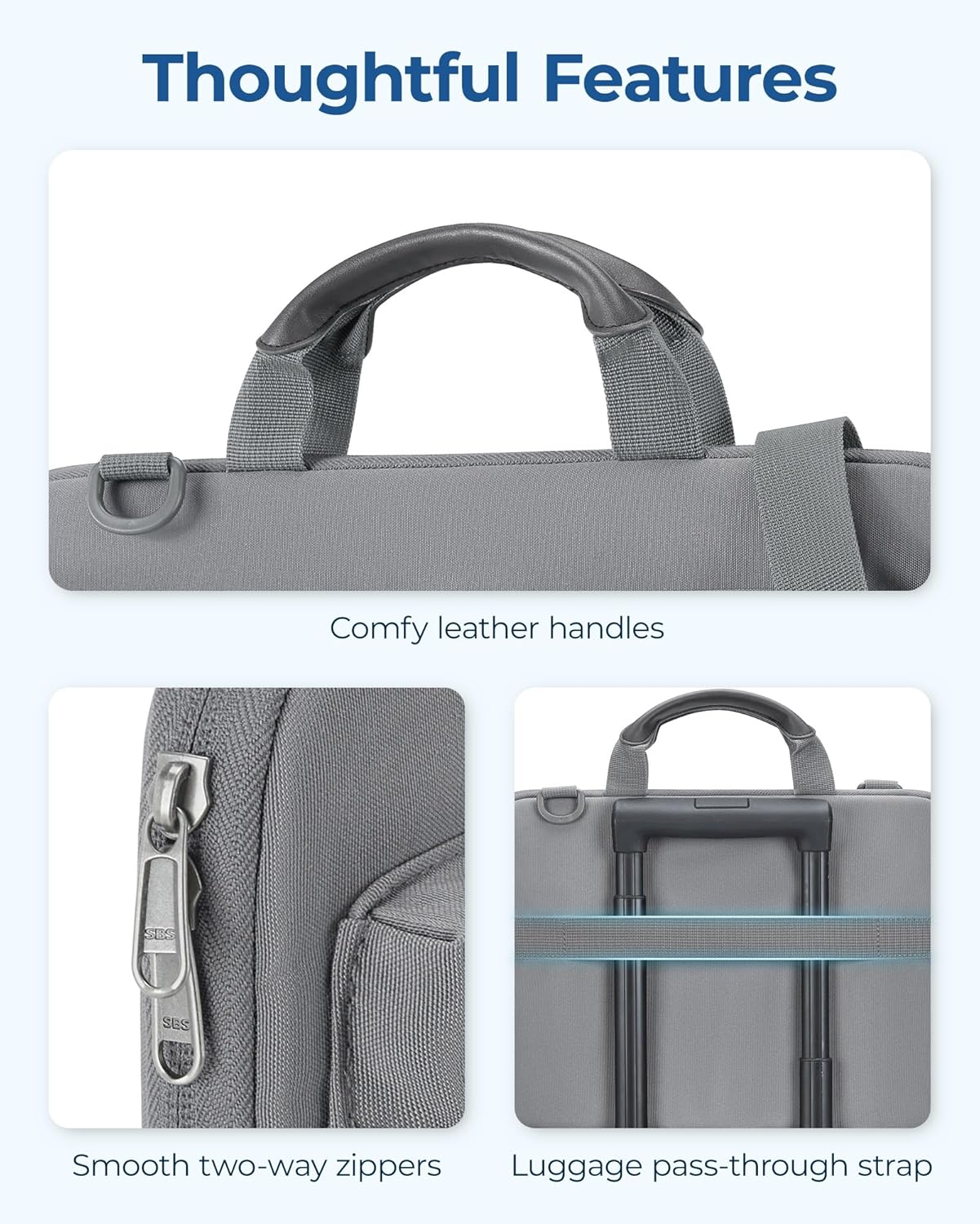 - User-Centric Details: We’ve thought of everything to enhance your experience. This laptop case features a refined leather handle for comfortable carrying, smooth dual zippers for effortless access, and a luggage strap for secure attachment to your suitcase. The adjustable, detachable shoulder strap offers versatile carrying options. These thoughtful details prioritize your privacy and convenience, ensuring a seamless integration into your daily routine
