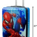 - SPIDER-MAN TRAVEL LUGGAGE: Children’s hard sided luggage with a visually striking design featuring Spider-Man posed against a blue background; Hard side luggage carrier meets most airline requirements for carry-on luggage and fits into most overhead bins