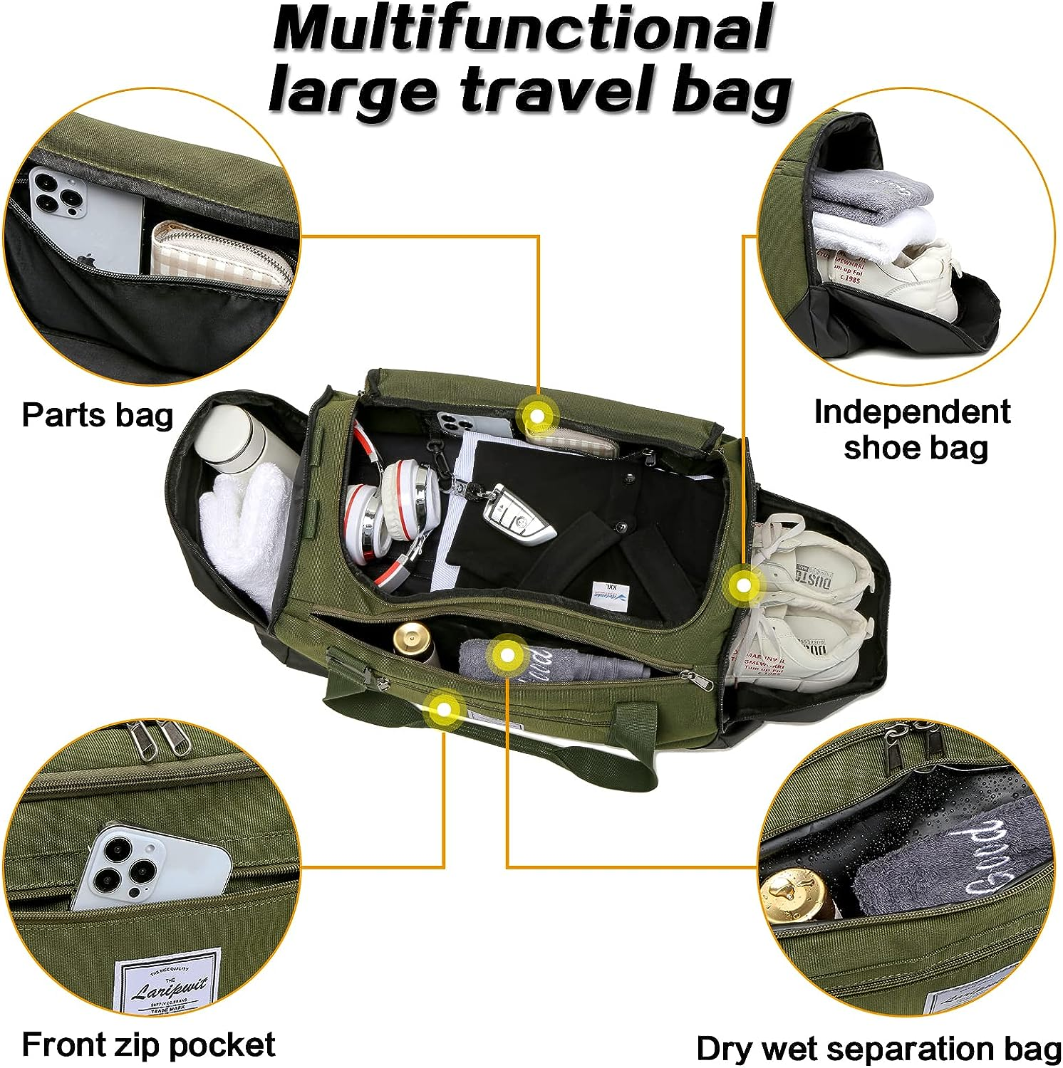 • 【Multiple Pockets】Duffle bag for men has 1 main bag, 1 front zip pocket, 1 wet pocket, 1 independent shoe compartment, 1 side zip pocket, 1 inner zip pocket, 2 hand webbing straps, 1 back luggage sleeve.