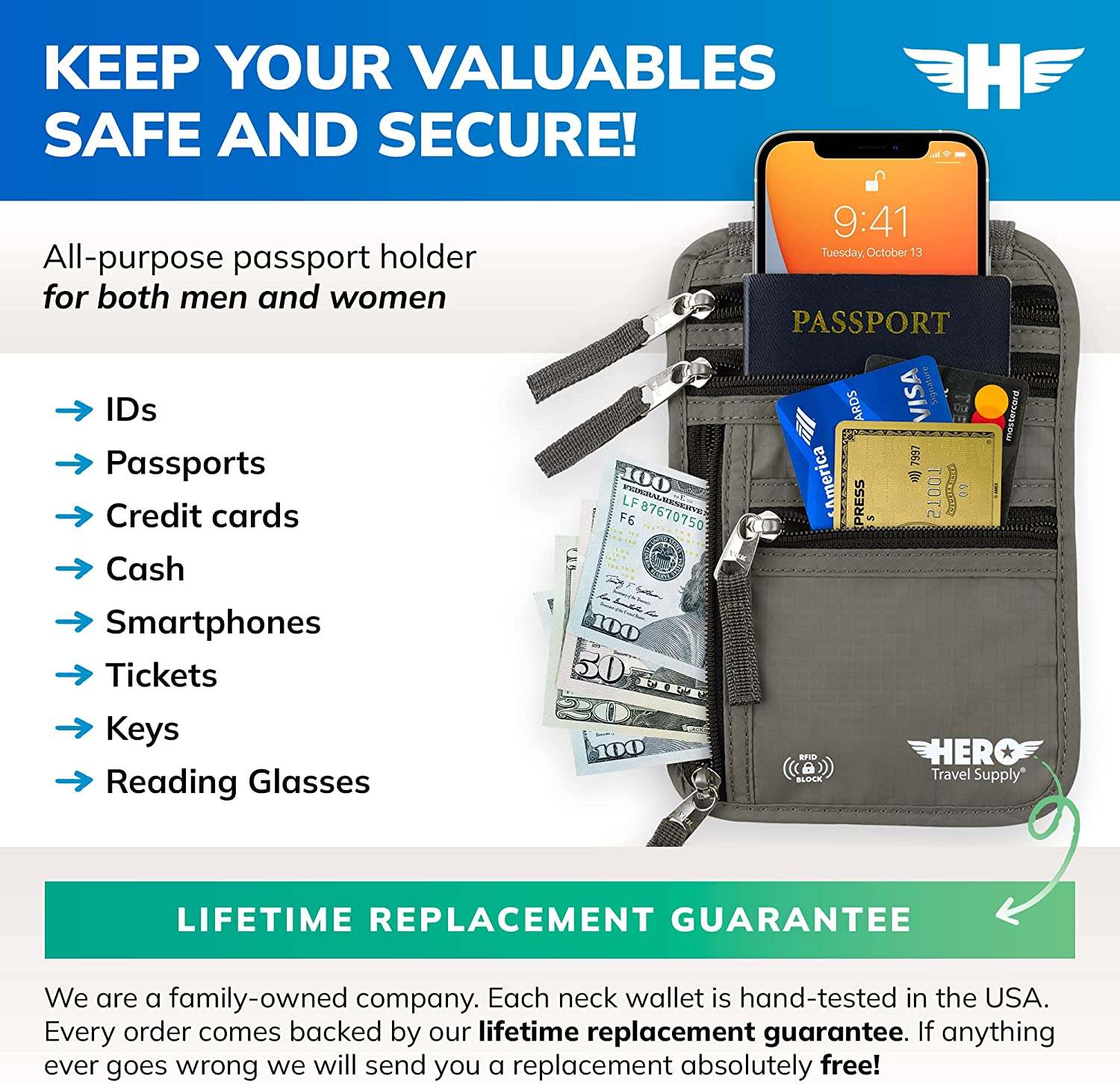 - LIFETIME REPLACEMENT GUARANTEE – We individually test every HERO Neck Wallet in the USA before shipping. And every order comes backed by our lifetime replacement guarantee. If anything ever goes wrong we will send you a replacement absolutely free!
