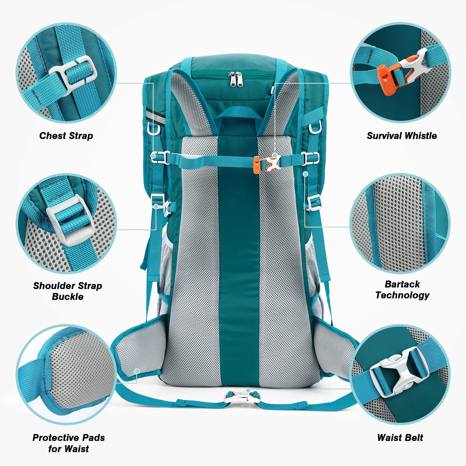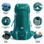 - [Multi-function & Water Resistant] – The hiking backpack with rain cover can protect your stuff from the rain. There are also convenient zippered pockets on the top lid, sides and hip belt, two compression straps on each side. The top and bottom straps can hold items such as a rolled-up tent or sleeping bag. There is a whistle on the chest strap, and reflective webbing improves visibility.